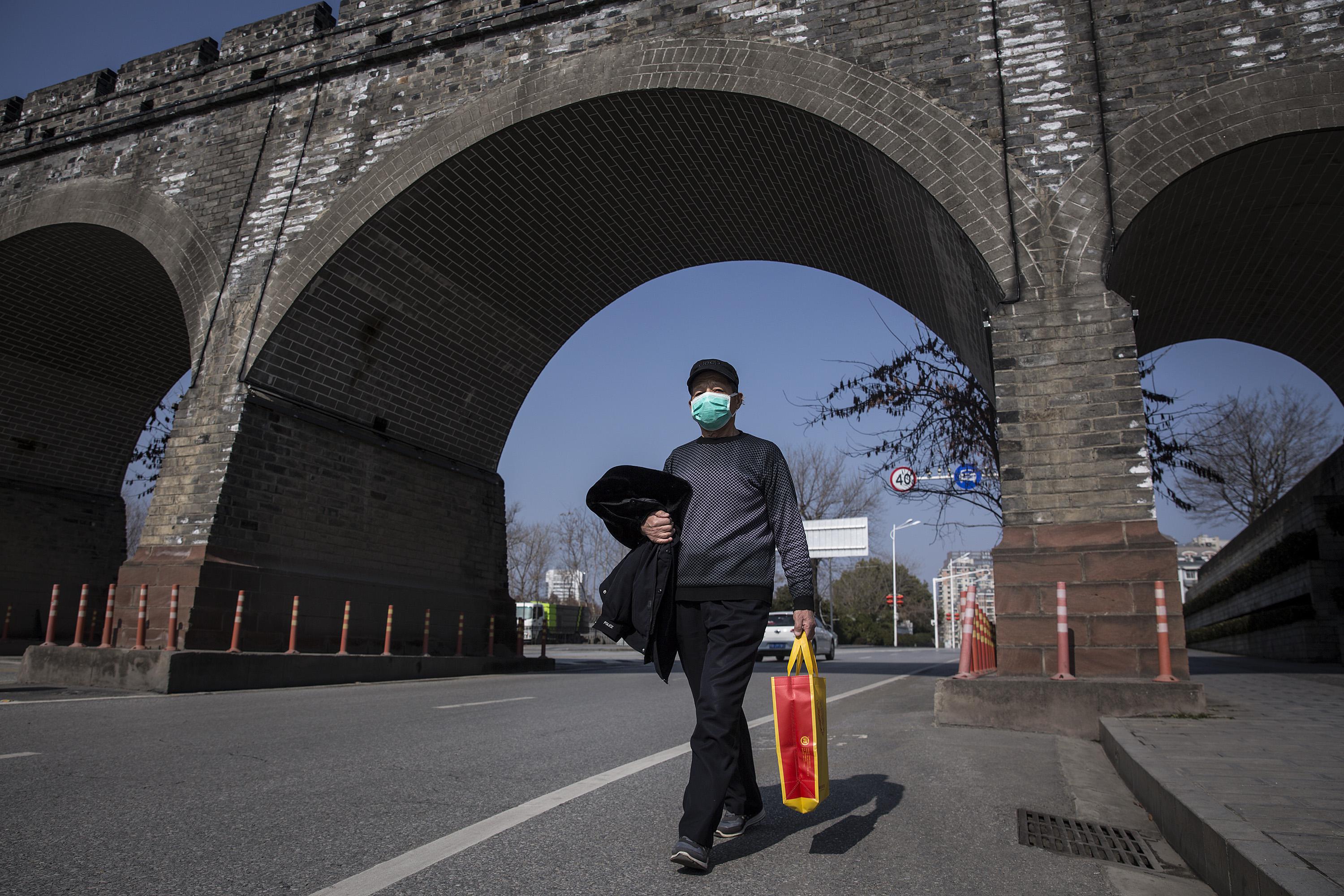A man wearing a protective mask walks through the old city gate on February 9, 2020 in Wuhan, China.